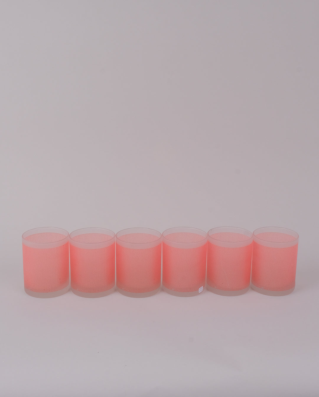 Ensemble de 6 verres à eau en verre dépoli et motifs de grille rouge.