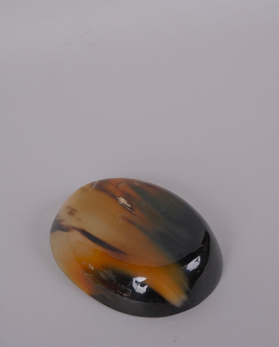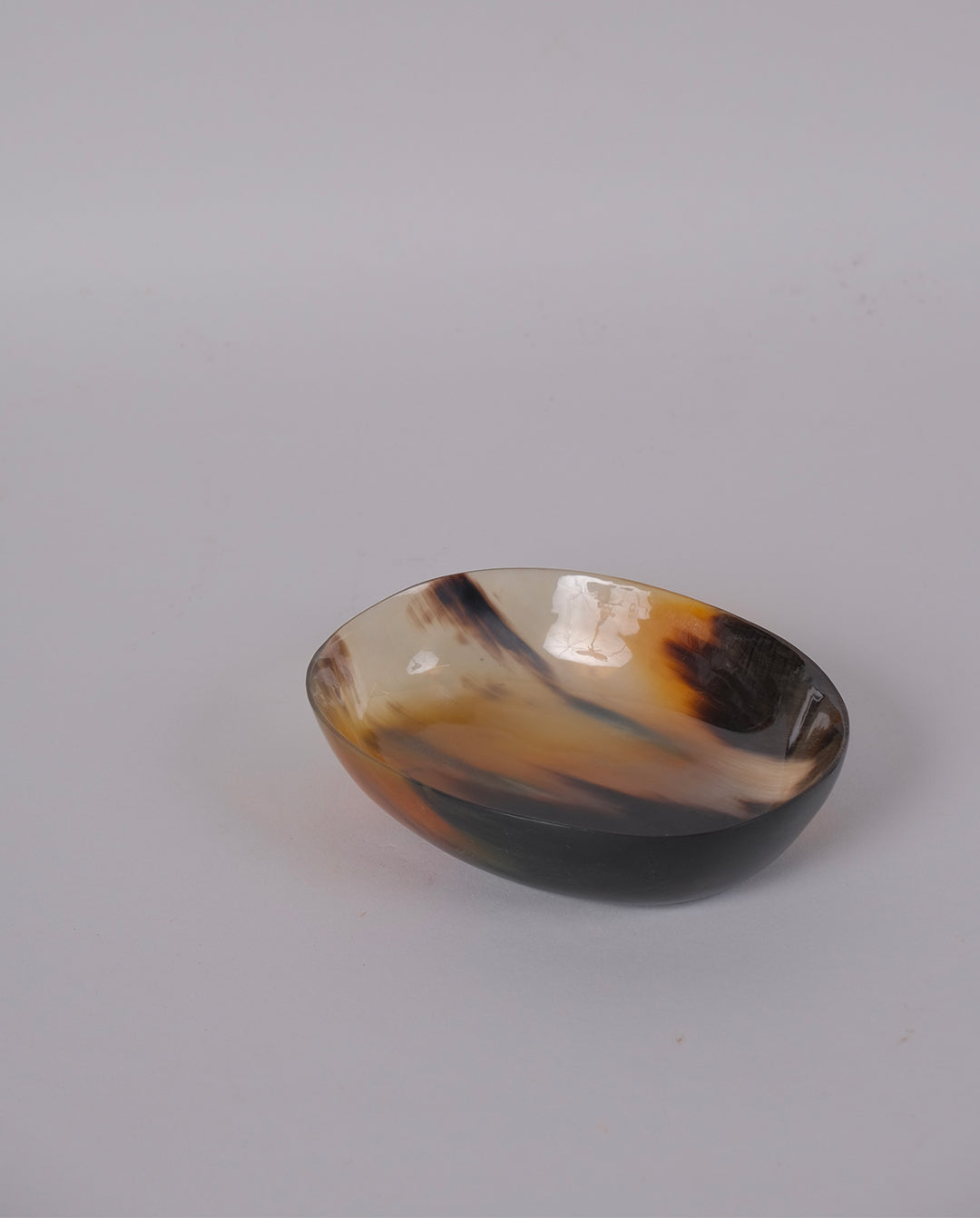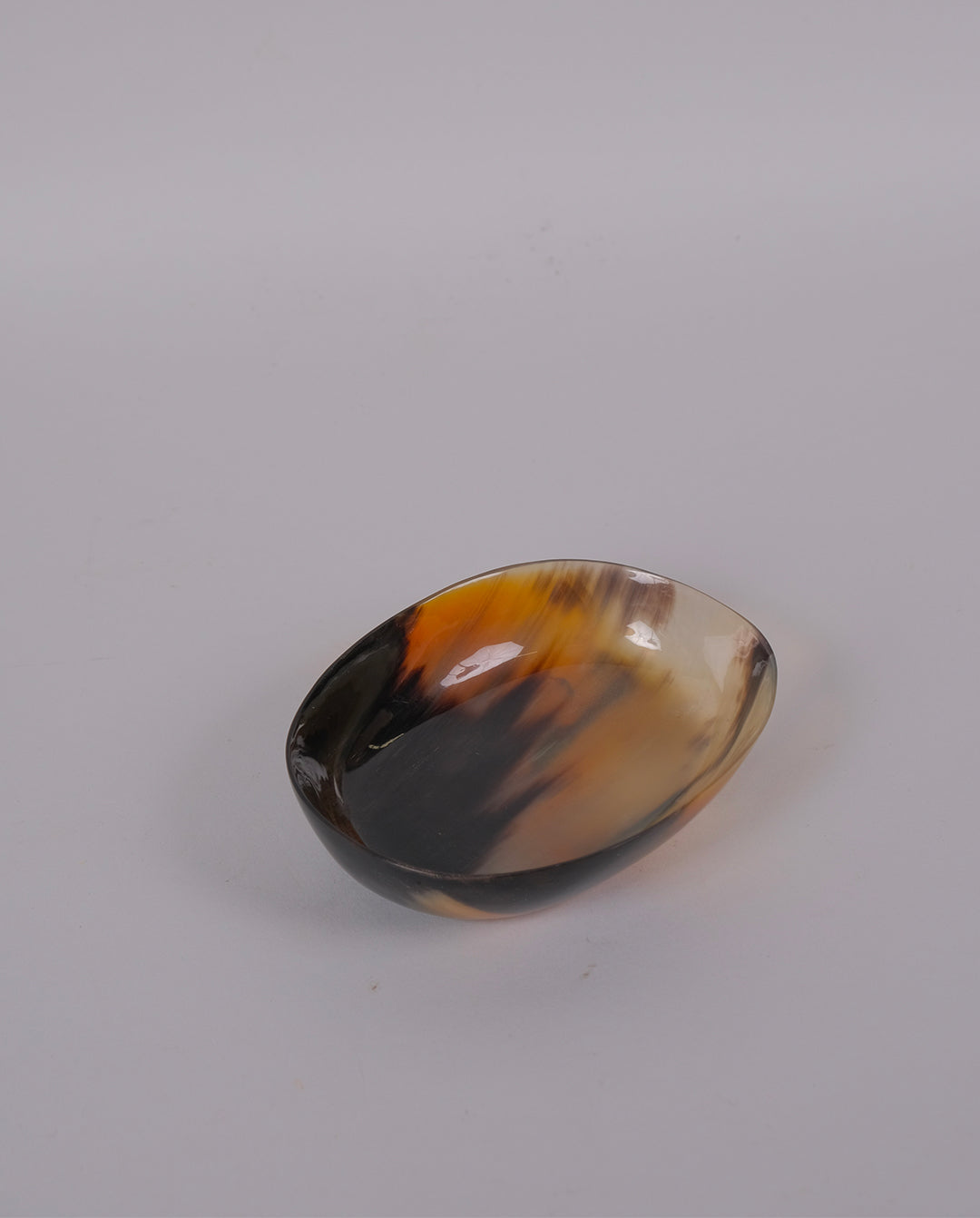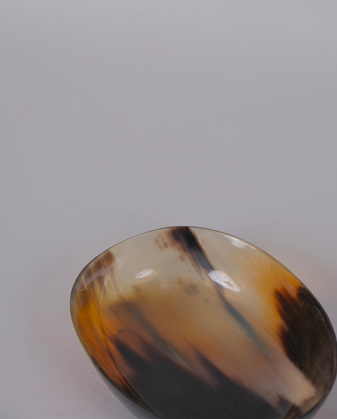 Vide poche en corne à motifs façon écailles de tortue marron et beige.